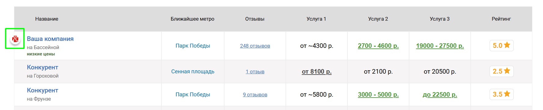 Иконка 16х16 пикселей будет отображаться слева от названия вашего салона в таблицах, выделяя его среди прочих. Опция увеличивает вероятность перехода на страницу компании и рекомендуется в качестве дополнения к прочим методам продвижения, в первую очередь для салонов с узнаваемым брендом.
